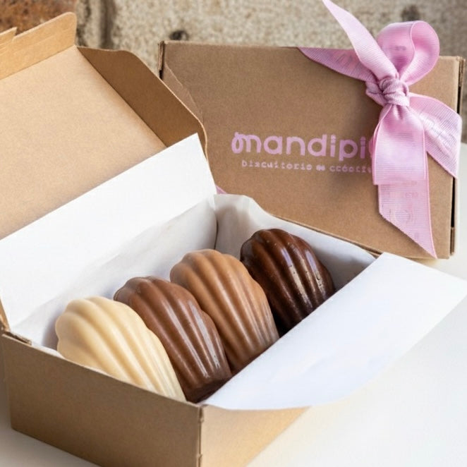 Découvrez Mahogany, une box de 4 madeleines résolument gourmande. Chaque madeleine est sublimée d'une fine coque de chocolat et garnie d'un coeur gourmand.