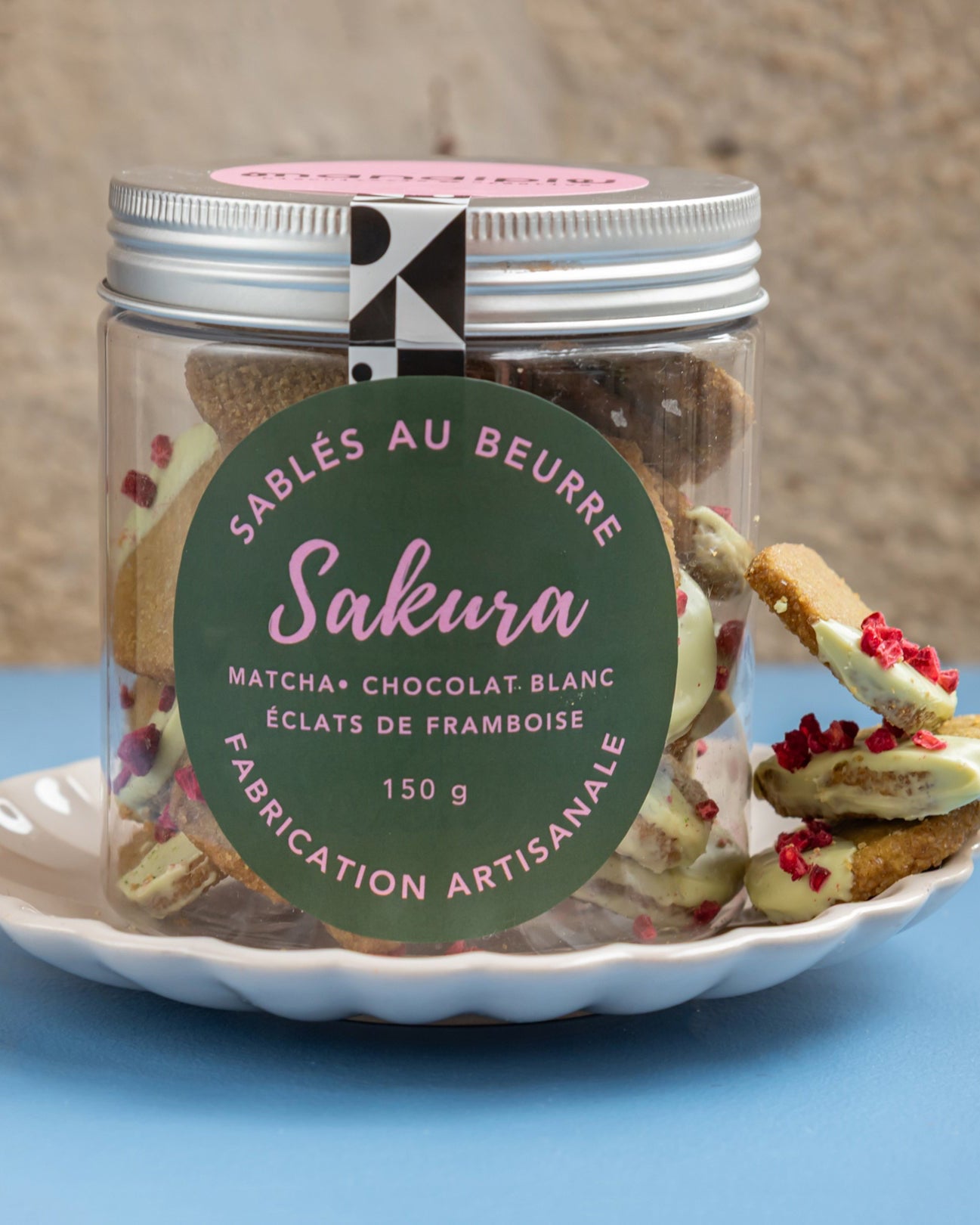 Découvrez nos sablés SAKURA, des sablés au savoureux goût de matcha et de framboise.